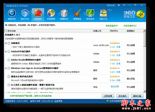 经过几年前的一场360VS流氓软件的战争,如今流氓插件已经越来越少了,但是一些软件自带的插件仍然很多,而这部分插件很多都可以清除,下图可见,在点选清理插件功能后,360会自动检测本机所安装的插件,并显示明细。
