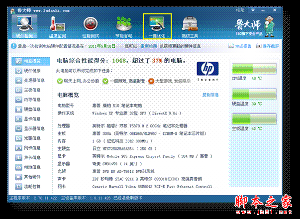 最后,我们可以使用鲁大师进行优化,点击硬件检测进到鲁大师主界面,因为要检测电脑硬件信息,可能会耗费一点时间,当然,界面上的“一键优化”按钮才是今天的主角。