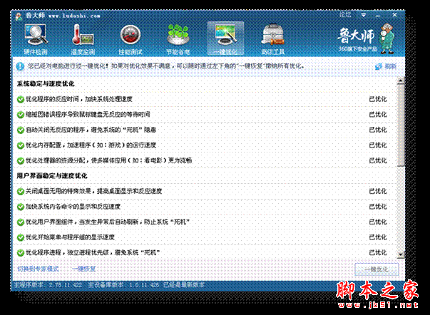 图中可见,一键优化会对系统稳定、用户界面、文件系统以及网络安全四个方面的稳定与速度进行优化,具体明细十分清楚,相信经过优化后大家会有一个全新的使用感受。