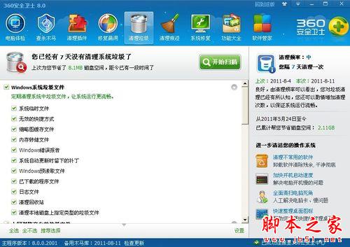 这里用360安全卫士,一般电脑安装的安全卫士都有这个功能(你可以选择其它的软件,网上很多下载的),打开安全卫士,选择清除垃圾,然后点击开始扫描,这里扫描有段待的时候,等扫描完点击清除垃圾就OK啦。
