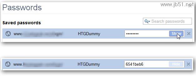 用鼠标点击一下【Show】(显示)按纽就能查看到对应网站和账号的密码了。这和前面Firefox中的效果是一样的。但是和Firefox不同的是Chrome是没有主密码这一项的。