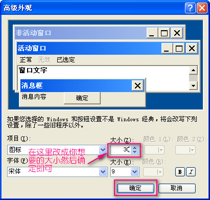 在桌面点右键--弹出显示属性--选择外观--选择高级--在“项目”里点下拉菜单---选择图标,然后在右边选择合适的大小就可以了