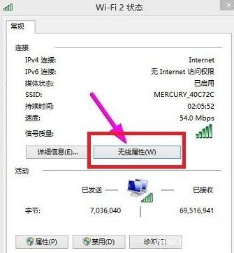 3、在弹出的wifi状态中选择无线属性,如下图: