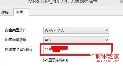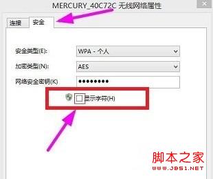 4、在弹出的无线属性中选择安全,然后把下图中显示字符前面的框点击选上 ,就可以看到无线密码了,如下图:
