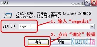 1、点击屏幕左下角的“开始”找到“运行”菜单项单击,在运行对话框的输入框中键入regedit,然后点“确定”按钮: