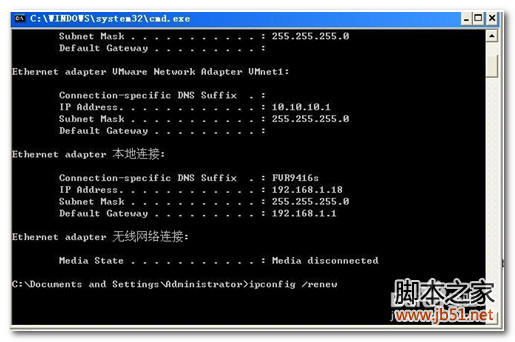 运行CMD--ifconfig /renew 以获取DHCP分配的IP地址;如图示: