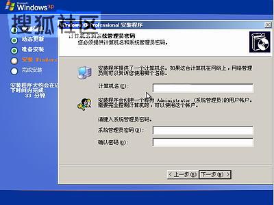 安装程序自动为你创建又长又难看的计算机名称,自己可任意更改,输入两次系统管理员密码,请记住这个密码,Administrator系统管理员在系统中具有最高权限,平时登陆系统不需要这个帐号。接着点“下一步”出现如下图