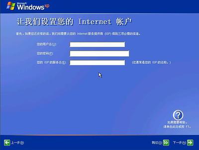 这里建立的宽带拨号连接,不会在桌面上建立拨号连接快捷方式,且默认的拨号连接名称为“我的ISP”(自定义除外);进入桌面后通过连接向导建立的宽带拨号连接,在桌面上会建立拨号连接快捷方式,且默认的拨号连接名称为“宽带连接”(自定义除外)。如果你不想在这里建立宽带拨号连接,请点击“跳过”按钮。