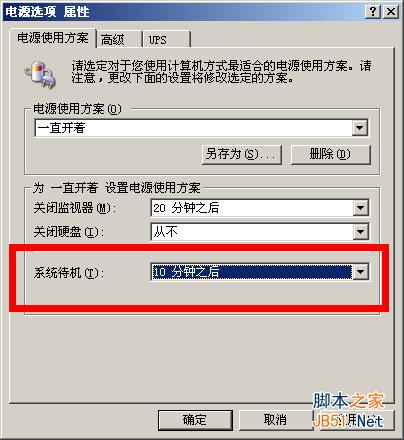 在屏幕保护程序标签页的下方,点击“电源”按钮,进入电源管理窗口,最下方“系统待机”一项,选择“10分钟以后”,就可以了,如下图: