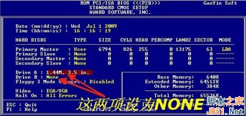 找到Drive A和Drive B:1.44M,3.5in,设为 None (关闭),