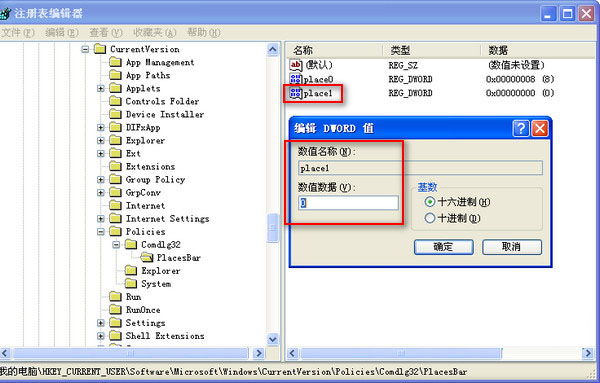 只要在注册表编辑器空白地方点击右键——新建——Dword值,将新值的名称重命名为“Place1”,然后双击这个新创建的值,将“数字数据”下面的文本框框中的值设置为“0”(如下图所示) ,确定即可。