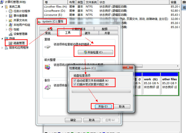 逻辑损坏(软件及系统原因):右键计算机--管理--磁盘管理--选择卷符(如C盘)右键属性--工具--开始检查,都勾选上,这样对每个盘符进行修复: