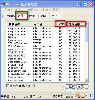 我们可以同时按键盘上的CTRL+ALT+DEL,调出WINDOWS任务管理器,查看一下CPU的占用情况及内存占用情况。