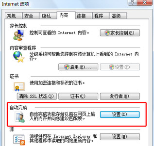 在“Internet选项”中选择“内容”标签,在“自动完成”栏点击“设置”