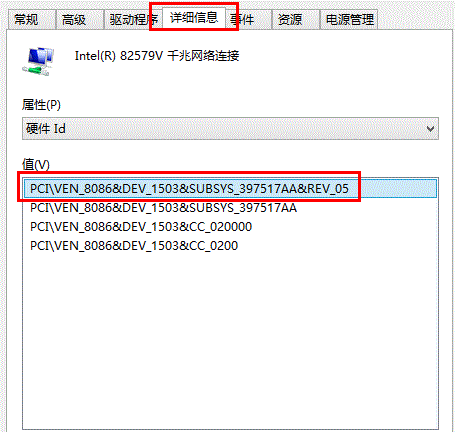 (2) 找到“详细信息”,在属性选项中选择“硬件ID”选项;