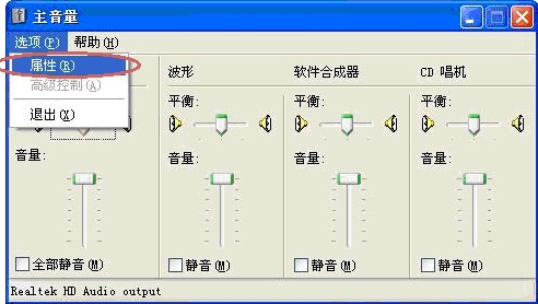 4. 在打开的主音量窗口里面,点击选项,选择里面的“属性”;