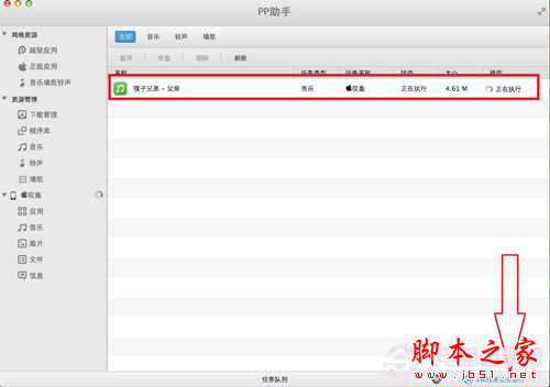 一,安装好PP助手Mac后,点击‘站点资源栏’的“音乐墙纸铃声”,点击音乐,找到自己喜欢的歌曲后点击 ↓ 下载