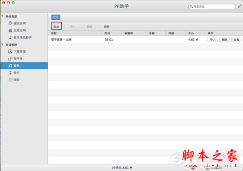 ①:打开PP助手,点击资源管理栏的音乐,之后在音乐管理面板上点击“添加”按钮