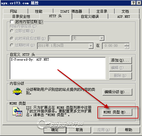 在IIS里所需要的站点—属性—HTTP头—MIME类型–