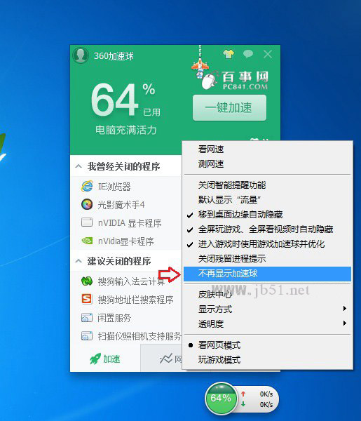 关闭360加速球很简单,我们点击360加速球打开加速显示界面后,在其上部点击鼠标右键,然后在弹出的右键菜单中,选择【不再显示加速球】,如下图所示。