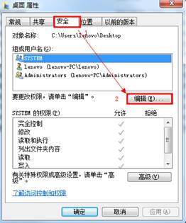 2. 右击“桌面”文件夹,选择“属性”,选择“安全”选项卡,点击“编辑”;