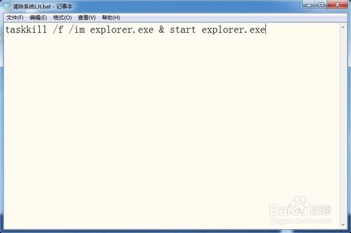 方法很简单,与上面类似,就是将第三步的代码改为“taskkill /f /im explorer.exe & start explorer.exe”