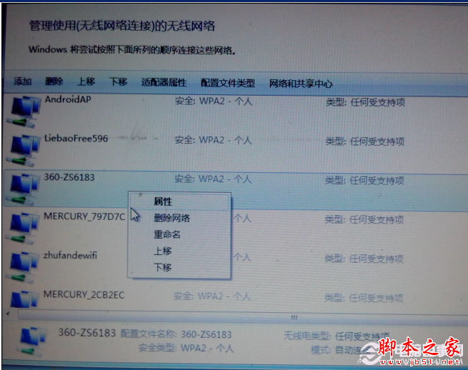 第三步:从该界面下删除该红叉对应的ssid名(鼠标右击--删除网络)