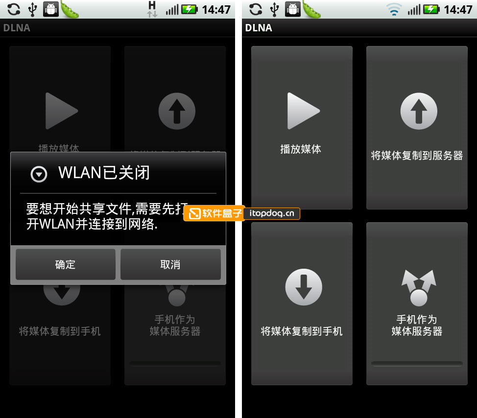 2、如果手机没有开启WLAN功能,会看到下图左侧提示,开启后会看到DLNA的功能菜单: