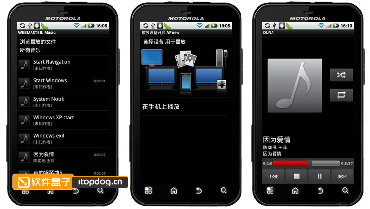 4、软件盒子是为了使用手机来播放电脑上的音乐文件,所以这里选择音乐文件夹就可以看到电脑中共享的音乐了,点击“在手机上播放”,见下图,Motorola defy(ME525)已成功使用DLNA通过WLAN来播放电脑上的音乐啦!