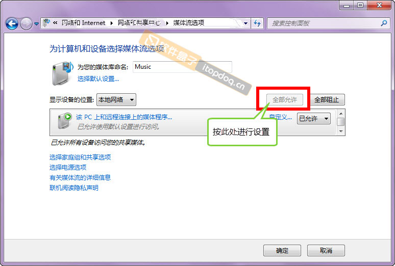 以Windows 7为例,使网络位置保持为“家庭网络”,在“高级共享设置中”其它项保持默认,点击“选择媒体流选项”见下图: