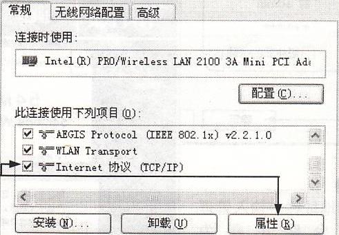 在“网络连接”窗口中的“无线网络连接”图标上单击鼠标右键,选择“属性”命令在“无线网络连接属性”对话框中,选中“Intenet出议CTCP/IP)”复选框,然后单击“属性”按钮