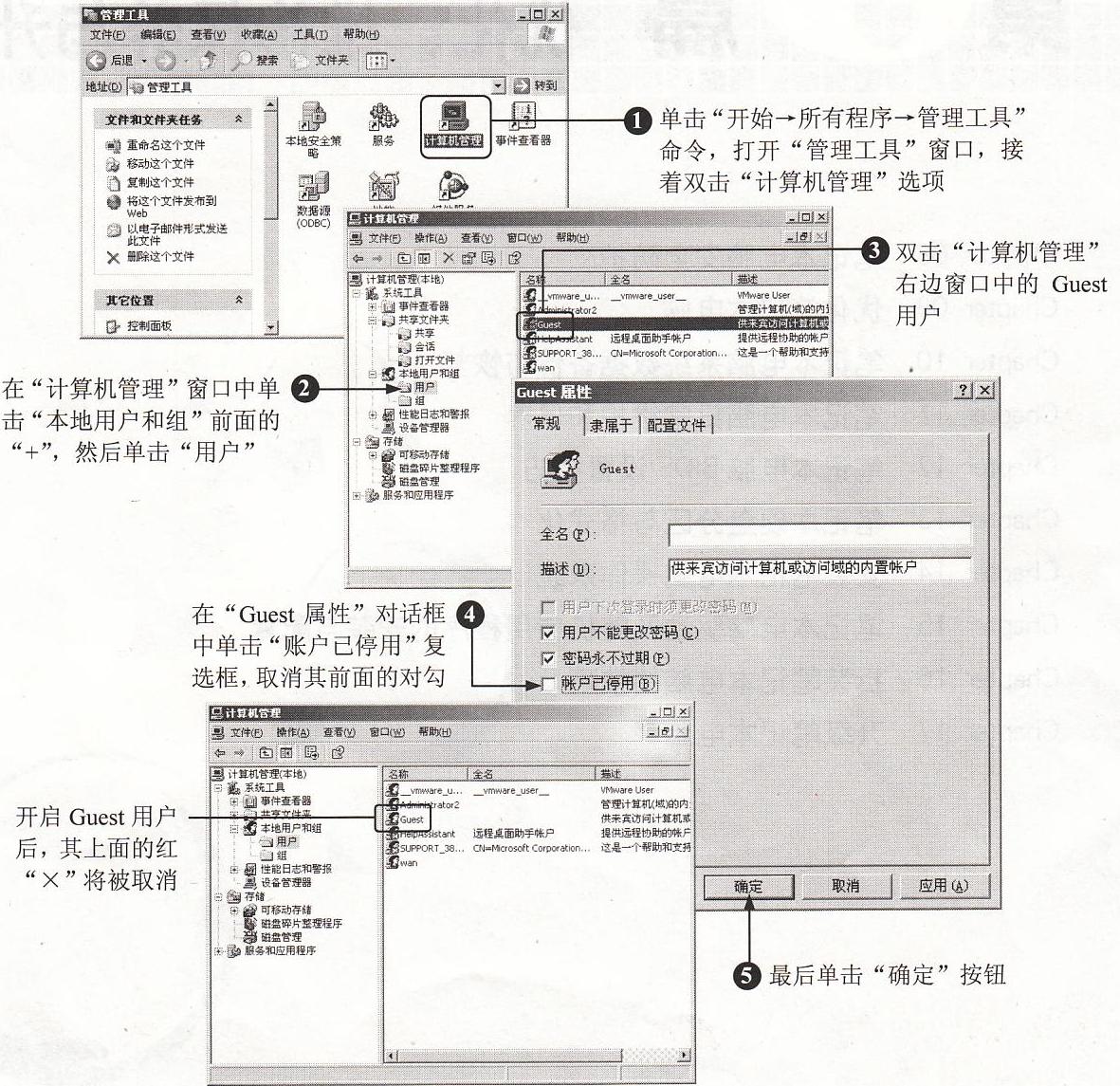 首先将网络中的电脑设在同一个组中,同时开启Guest用户和开启本地安全策略中Guest用户从网络访问功能,设置方法如图7 44所示。
