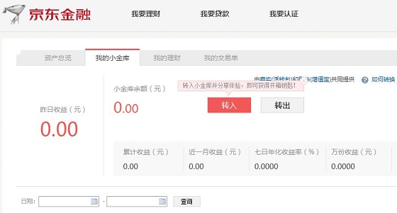 进入到京东金融的页面http://jr.jd.com/,然后点立即转入,接下来会弹出登陆账号输输界面,然后登陆自己的京东账号(小金库随时用于京东的消费,和京东白条一起使用,0.01元期存)