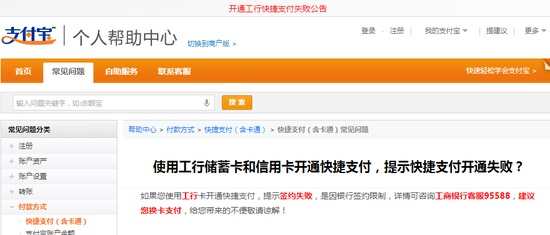 针对此问题,今日支付宝在其官网用户帮助中心置顶发布《开通工行快捷支付失败公告》,称如果用户使用工行卡开通快捷支付,提示签约失败,是因银行签约限制,详情可咨询工商银行客服,并建议您换卡支付。