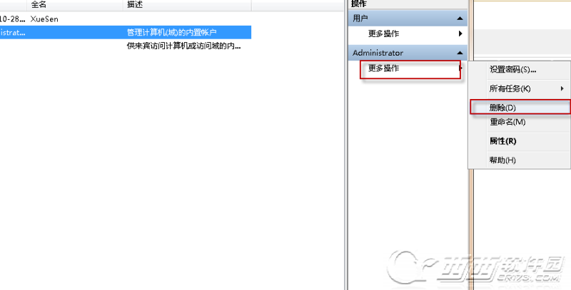 然后,在右侧面板中,右击要删除的用户账号,选择“删除”;
