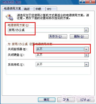 4、电源使用方案我们一般都选择“家用/办公桌”,使用方案里面的“关闭监视器、关闭硬盘、系统待机”三项都设置为“从不”如下图。