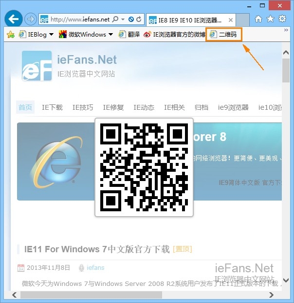 3、现在收藏的链接就出现在我们收藏夹栏,单击该“二维码”链接,就可以将当前打开网页网址生成二维码,并在当前的IE浏览器窗口中打开。