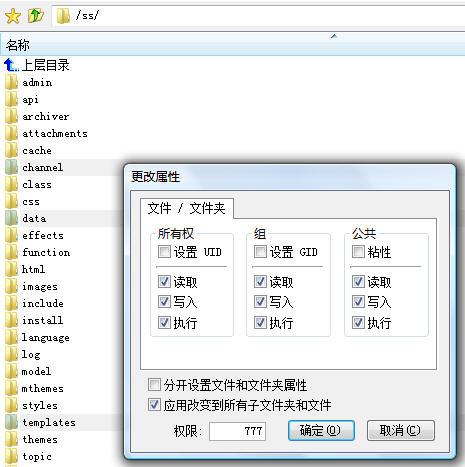 将“权限”项中的数字改为“777”,确定即可(前提是您的帐号有修改文件属性的权限)