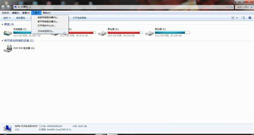 第一步:双击打开桌面上“计算机”图标,单击菜单栏的“工具”,弹出的快捷菜单单击“文件夹选项”。