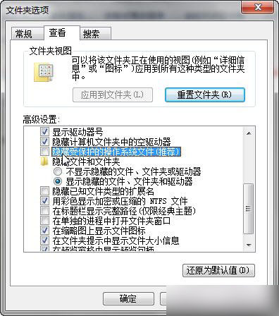第二步:切换到“查看”选项卡,在高级设置列表框中去掉“隐藏受保护的操作系统文件(推荐)”复选框,并选择“显示所有文件和文件夹”,设置完成后单击“确定”按钮。
