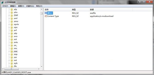 第二步:打开注册表编辑器窗口,在左侧的注册表树依次展开到以下分支“HKEY_CLASSES_ROOT\.exe”,并确保右边窗口默认值的参数为“exefile”。