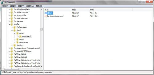 第三步:接着再定位到以下分支“HKEY_CLASSES_ROOT\exefile\shell\open\command”,并确保右边窗口默认值的参数为“"%1" %*”。