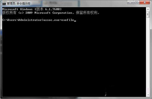 第二步:在打开的命令提示符窗口中键入“assoc.exe=exefile”命令并按回车键即可恢复exe文件的关联。