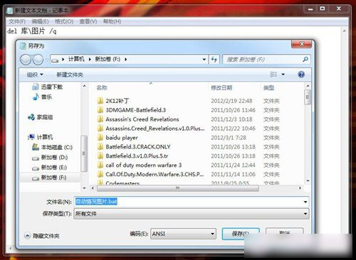3、在“新建文本文档”输入完成后,把这个文件存为自动清空图片.bat,请注意格式为bat,你可以直接输入后缀名。