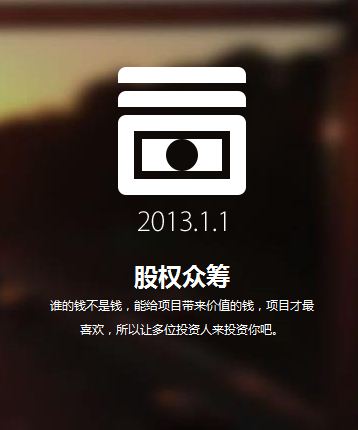 股权众筹主要的功能就是融资,你的钱为一些创新型企业、一些中小项目提供启动资金,回报方式为资金发放。股权众筹相比非股权众筹,风险更大、资金更多,回报期更长,需要更长远的投资眼光。如徐小平就曾经作为天使投资人注资过聚美优品,当然,他也有很多失败的案例。目前,股权众筹网站有天使汇 、大家投、创投圈等。