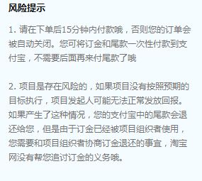 无论是非股权众筹还是股权众筹,支持者都会有一定的风险,并且网站并不对承担风险及售后服务,如“淘宝星愿”风险提示就如下图。