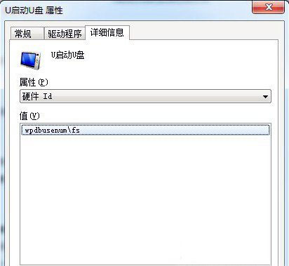 第二步、在u盘右键点击选择“属性”,在“属性”窗口中选中“详细信息”标签,并在设备“属性”下拉框中选择“硬件ID”,就会出现这个u盘的硬件ID,这是我们所需要的,用鼠标右键选中复制,由于我们下一步还有复制一个ID,建议粘贴在记事本里。