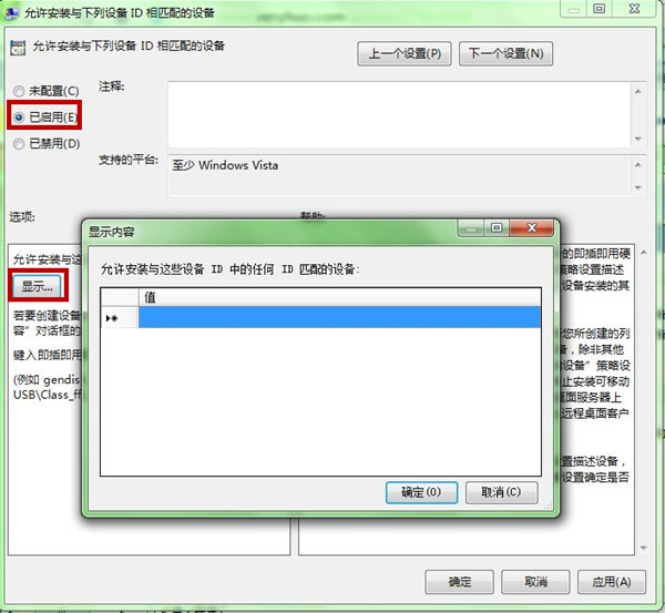 第五步、在“本地组策略编辑器”窗口中,依次展开“计算机配置”-“管理模板”-“系统”-“设备安装”-“设备安装限制”,然后鼠标双击右侧我们在“允许安装与下列设备ID相匹配的设备”选择“已启动”,我们可以看到线面有“显示”,我们点击它,添加我们之前复制的两个硬件ID,这样电脑就可以识别了。以后,如果有新的USB硬件加入采用的方法一样。
