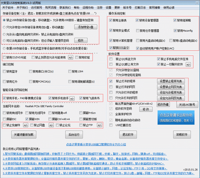 此外,通过“大势至电脑U口禁用软件”还可以禁止电脑发邮件、禁止网盘上传附件、禁止FTP文件上传以及禁止QQ发文件等,从而全面保护电脑文件的安全,防止通过各种途径泄露了。