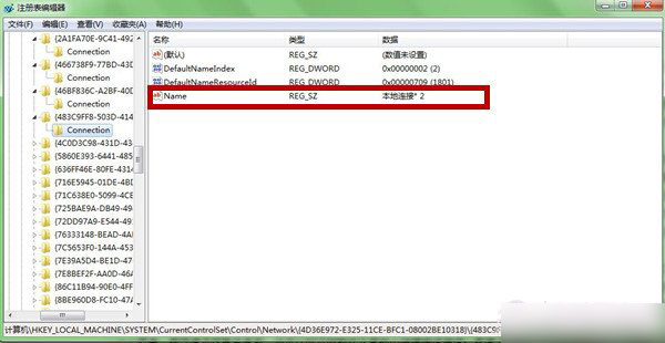4、这个子键下面保存着关于本地连接的信息,都有多个子键。每个子健的下面都会有“Connection”子键,你点击它,右侧窗口就会显示对应的是本地连接几,然后直接删除相对应的旧连接的整个子健。由于这些本地连接并不是按数字顺序来排列的,所以本没有准备的相关文件夹名称,需要你仔细的去查看。如果你点开后右侧显示的内容,和下图一样,就证明你已经找到,就可以直接删除相对应的旧连接的整个子健,关机重启即可。